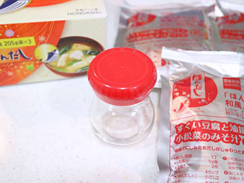我が家ではいつも使っている「ほんだし」小瓶に詰め替えて使っています。
